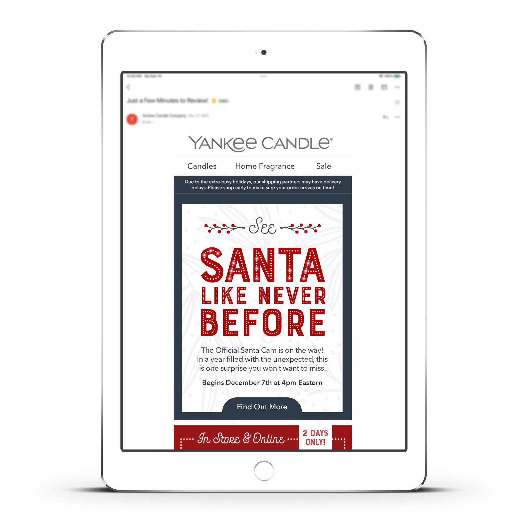 With families unable to visit Santa at the YC flagship store, we brainstormed other ways we could get people involvedβvirtually, from the safety of their homes. Partnering with TMA, we landed on launching something we called Santa Camβthe first ever for Yankee Candle and Newell Brands.